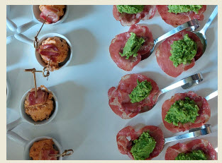 Champignon farci à la tapenade de tomate / Coppa grillée et purée de petit pois aux noisettes