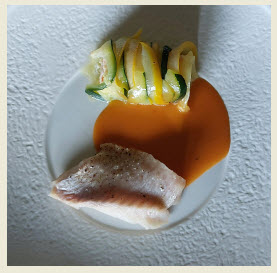 Filet de sébaste sauce crustacés / caneloni de courgettes aux fruits de mer