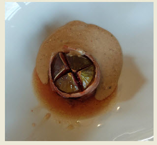 Figue rôtie et lardée / sauce pignon de pin