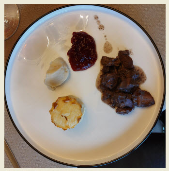 Civet de cerf, cannelé de chou fleur, purée de céleri, airelles