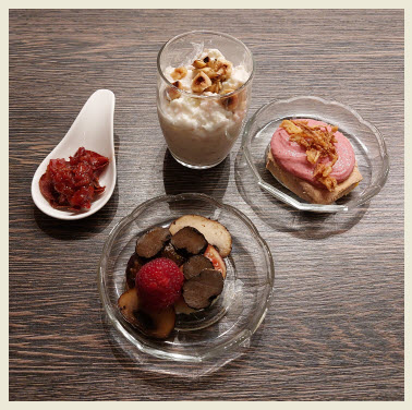 Tartare de tomates confites au ketchup de cassis sur lit de viande des grisons croquante ; verrine de ricotta, truite fumée et pomme jonagold ; foie gras, crème de betterave et oignons frits ; chèvre cendré, figues rôties, champignons bruns, framboise et truffe.