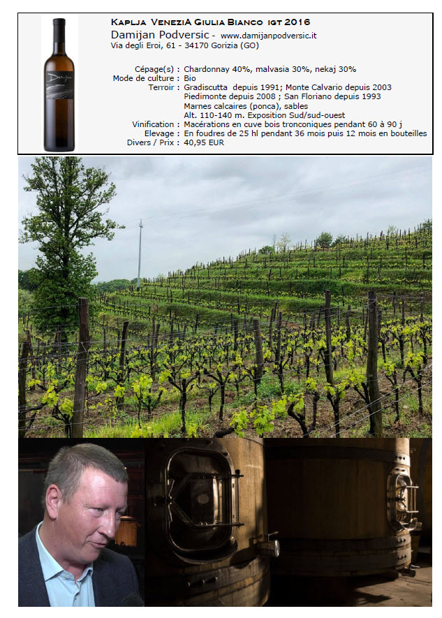 Vin de macération dans la veine de Josko Gravner comme la ribolla dégustée auparavant. Bouquet profond et élégant sur les fruits jaunes mûrs, l’abricot sec, le coing,la pâte de fruit et la compote de pomme. On perçoit également quelques épices douces (vanille, cannelle), un peu de fruit sec, du gingembre, de la cire et des notes fumées insistantes. La bouche est puissante et concentrée, terrienne dans l’esprit mais élégante dans son horizontalité avec malgré tout de l’amplitude et du dynamisme grâce à une belle fraîcheur. Très belle persistance saline et confite qui donne de la cohérence à l’ensemble. Les quelques amers en sous-main ne gênent en rien.